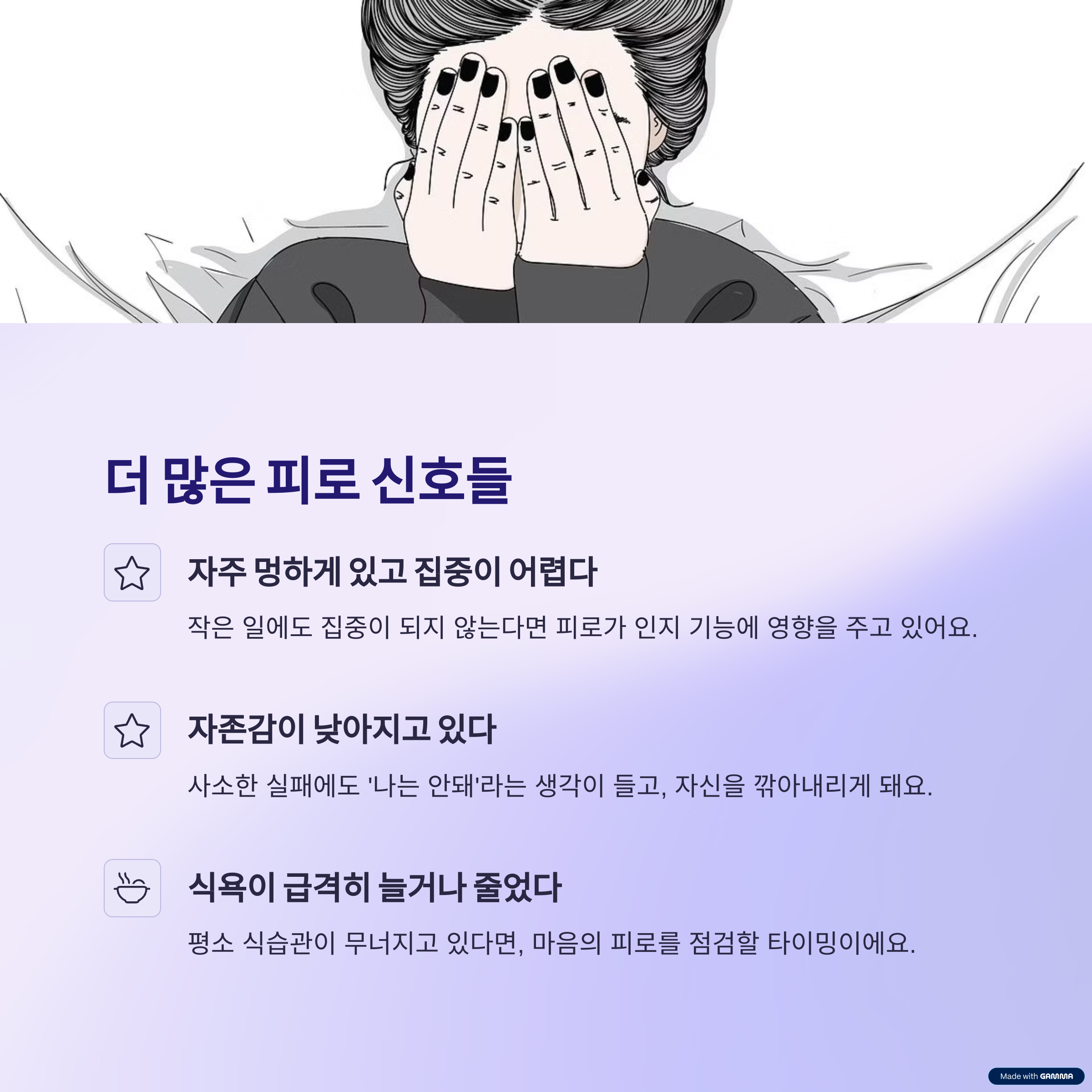 피로가 쌓이면 스스로를 돌보는 힘도 줄어들어요.