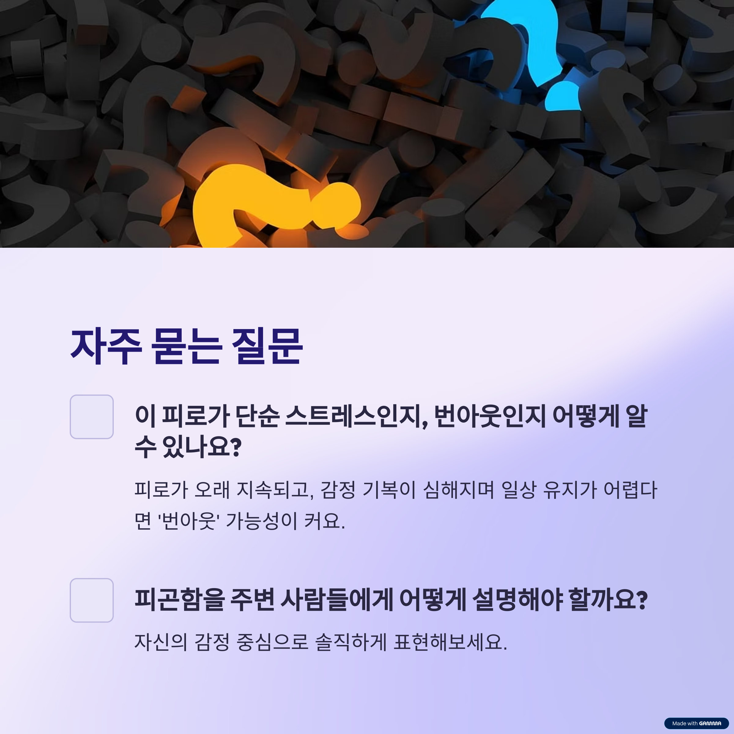 A. 피로가 오래 지속되고, 감정 기복이 심해지며 일상 유지가 어렵다면 ‘번아웃’ 가능성이 커요. 전문가 상담도 좋은 선택입니다.