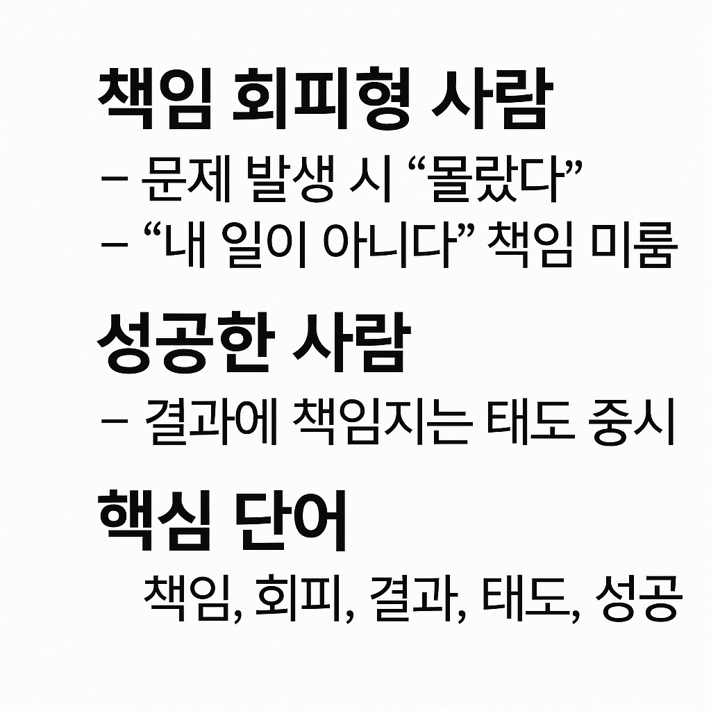 문제가 생기면 "나는 몰랐어", "그건 내 일이 아니야"라며 책임을 미루는 사람. 성공한 사람들은 ‘결과에 책임지는 태도’를 무엇보다 중요하게 여깁니다.
