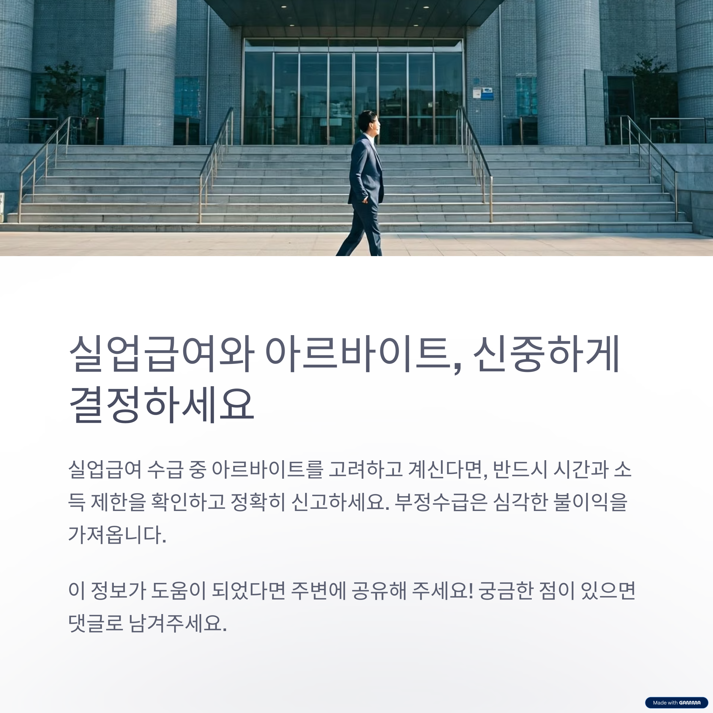 “실업급여받으며 알바 가능”은 절반만 맞는 말입니다. 가능은 하되 신고 의무를 다하고 기준을 넘기지 않을 때에만 유지될 수 있습니다. 실업급여 수급 중 소득활동을 계획하고 있다면, 반드시 고용센터에 사전 상담 후 움직이는 것이 안전합니다.
