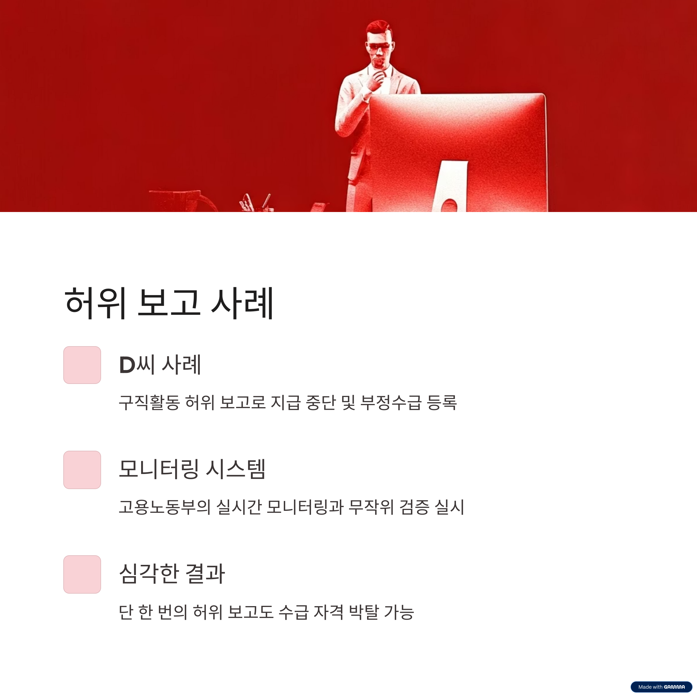 D 씨는 실제로 구직활동을 하지 않았음에도 이력서를 냈다고 허위 보고를 했습니다. 이후 고용센터의 무작위 확인 전화에서 진위가 밝혀져 지급 중단 및 부정수급 등록 처리되었습니다.