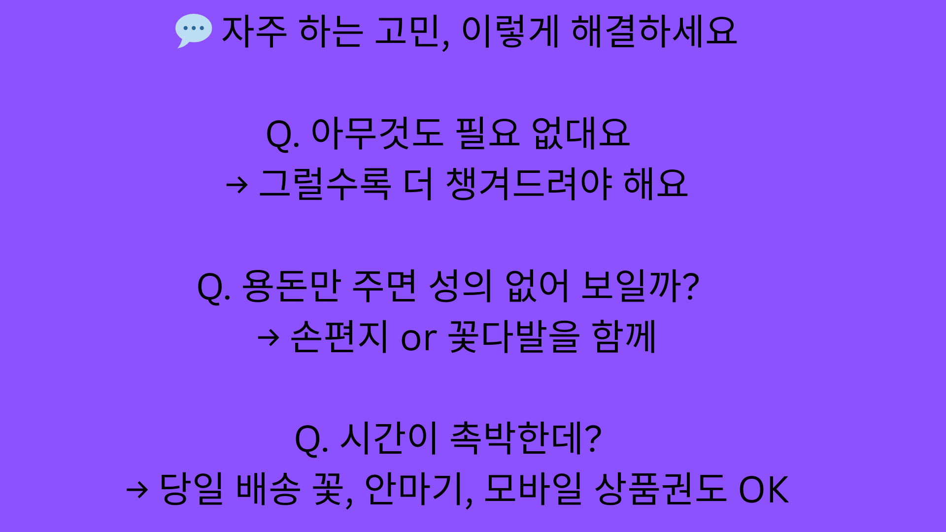 A. 용돈 + 손 편지 or 꽃다발 조합이면 충분히 정성 표현됩니다. - Q. 시간이 너무 촉박해요!