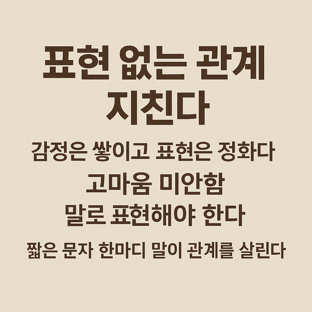 고마운 일도 당연하게 넘기고, 미안한 일에도 침묵한다면 어느 순간 상대는 지치게 됩니다. 감정은 쌓이는 것이고, 표현은 정화의 과정입니다. 표현이 없으면 관계는 점점 메말라 갑니다.
