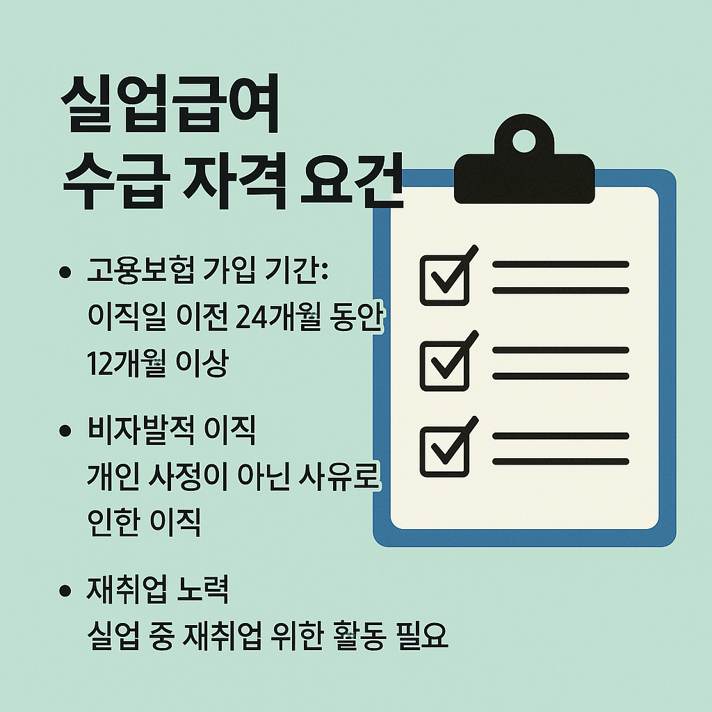 - 고용보험 가입 기간: 이직일 이전 24개월 동안 고용보험에 가입된 기간이 12개월 이상이어야 합니다.