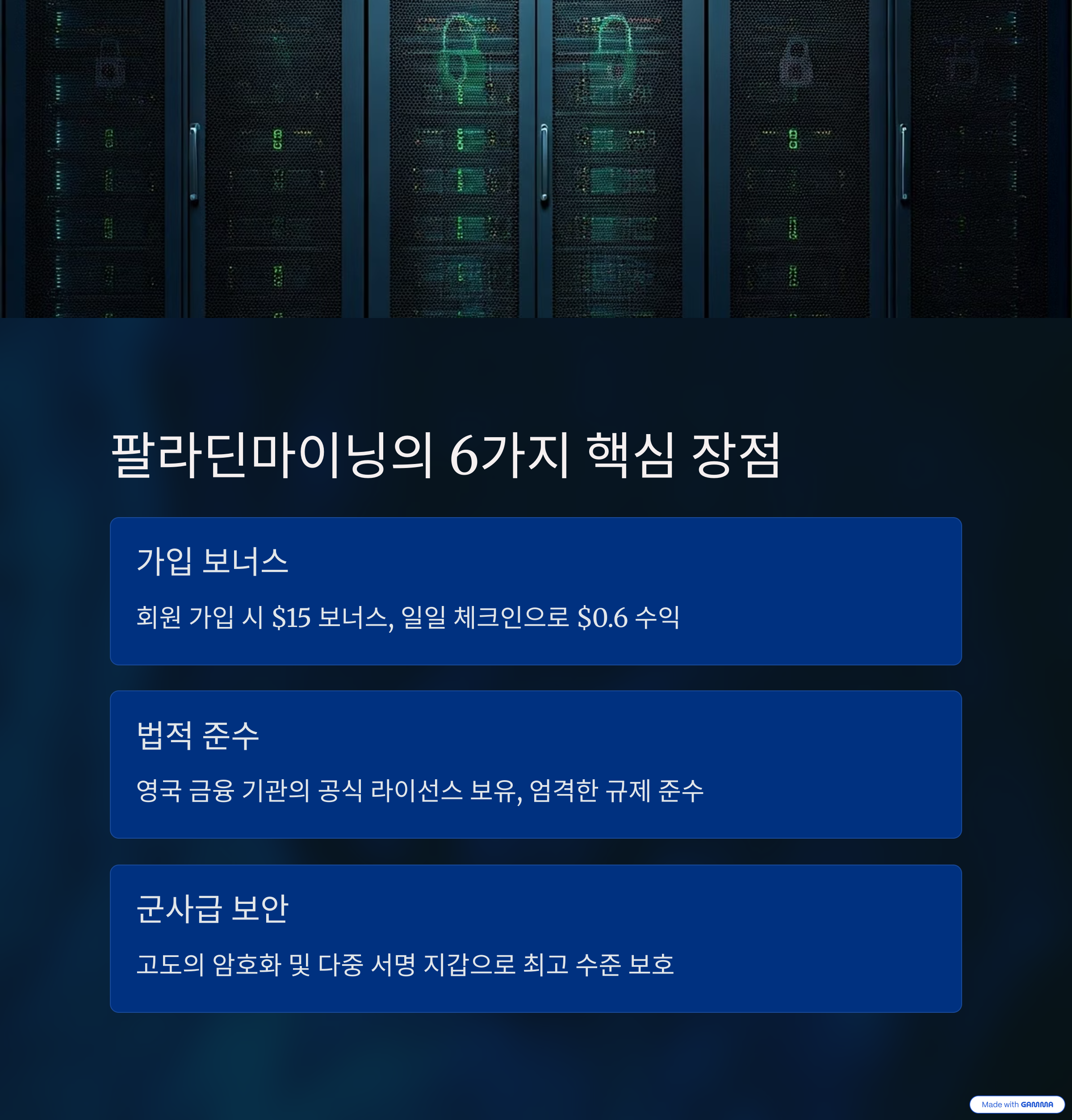 • 가입 및 보너스 수령: 팔라딘마이닝 웹사이트에서 계정을 생성하고 $15 보너스를 받으세요.
