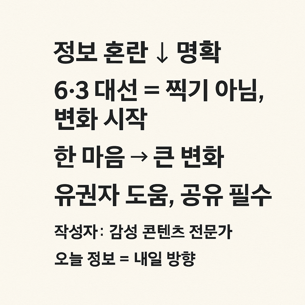 정보가 많아 혼란스러웠다면, 이제는 분명해졌을 거예요. 6·3 조기 대선은 단지 ‘찍는 것’이 아닌, ‘바꾸는 시작’입니다. 한 사람 한 사람의 마음이 모여 변화가 되길 바랍니다.